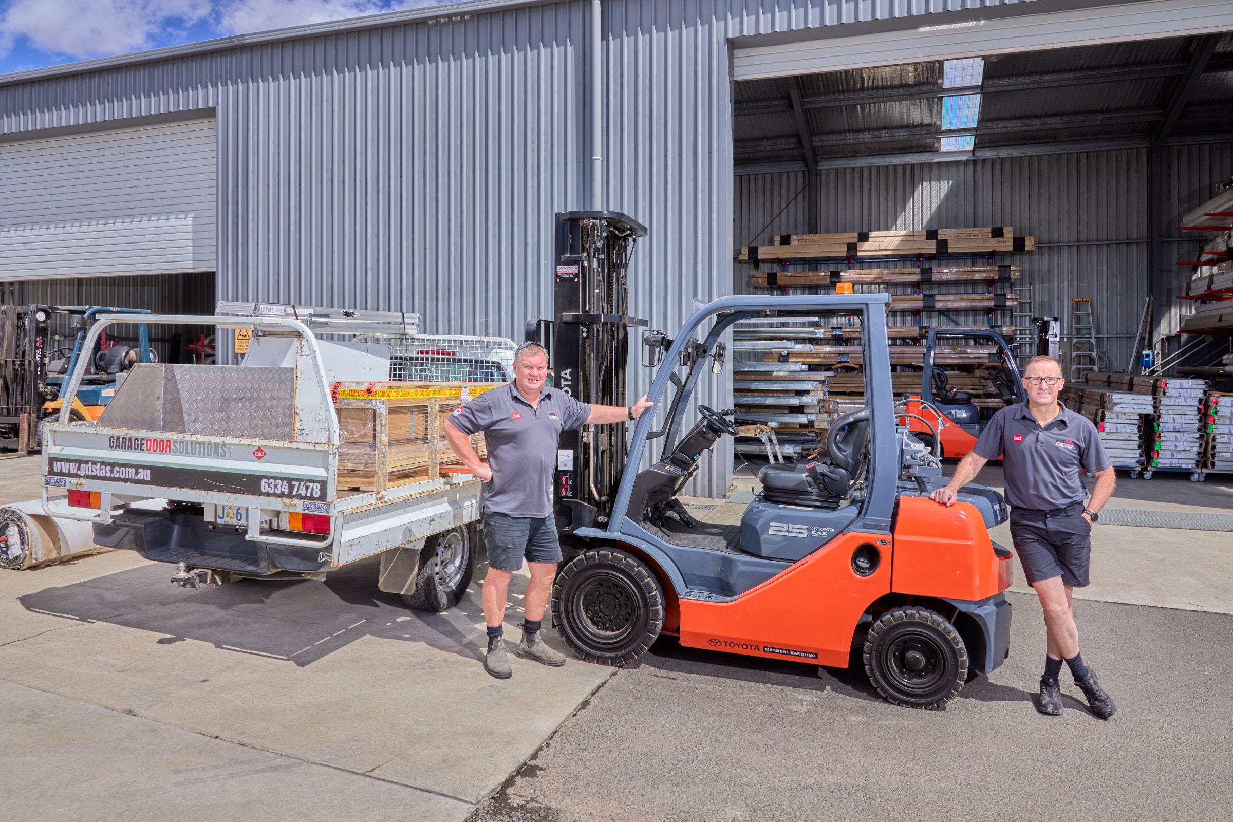 The three Garage Door Solutions forklifts are not only used for remote installations but also work at their warehouse to unload and store the doors, as well as loading them onto their fleet of utes to send out to job sites.